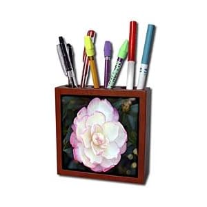 Product Description : White Camellia with Pink Tips Tile Pen Holder is great on a desk or counter top. Made of high quality solid wood with a satin finish. Image displayed on one inset high gloss 4.25" x 4.25" ceramic tile. Overall size is 5" x 5" x 1 2/3" with 3- 1 1/3" top holes.