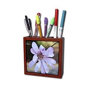 Product Description : Pretty Pink Flower Tile Pen Holder is great on a desk or counter top. Made of high quality solid wood with a satin finish. Image displayed on one inset high gloss 4.25" x 4.25" ceramic tile. Overall size is 5" x 5" x 1 2/3" with 3- 1 1/3" top holes.
