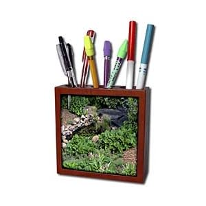 Product Description : Small Pond where lilies grow Tile Pen Holder is measuring 5w x 5h x 2d. Made from high quality solid mahogany wood with satin finish and one 4.25 commercial grade mirror gloss ceramic tile. Looks great on a desk or counter top with a full color custom imaged tile.