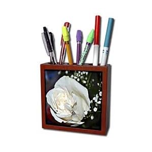 Product Description : Ivory Rose Tile Pen Holder is great on a desk or counter top. Made of high quality solid wood with a satin finish. Image displayed on one inset high gloss 4.25" x 4.25" ceramic tile. Overall size is 5" x 5" x 1 2/3" with 3- 1 1/3" top holes.