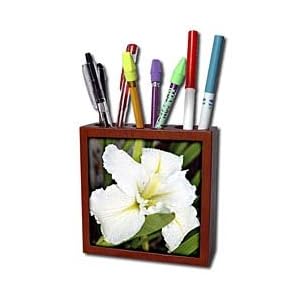 Product Description : White Iris Tile Pen Holder is great on a desk or counter top. Made of high quality solid wood with a satin finish. Image displayed on one inset high gloss 4.25" x 4.25" ceramic tile. Overall size is 5" x 5" x 1 2/3" with 3- 1 1/3" top holes.