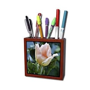 Product Description : Peach Rose Tile Pen Holder is great on a desk or counter top. Made of high quality solid wood with a satin finish. Image displayed on one inset high gloss 4.25" x 4.25" ceramic tile. Overall size is 5" x 5" x 1 2/3" with 3- 1 1/3" top holes.