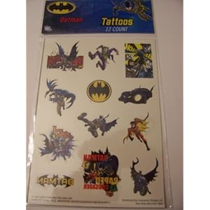 Category: Toys & Games Vendor: DC Comics Batman Tattoos Set of 12 Tattoos 12 Tattoos on a 5" x 7" sheet Lasts up to 5-6 days Product Description : DC Comics Batman Set of 12 Temporary Tattoos. 12 Tattoos on a 5" x 7" sheet. Lasts up to 5-6 days